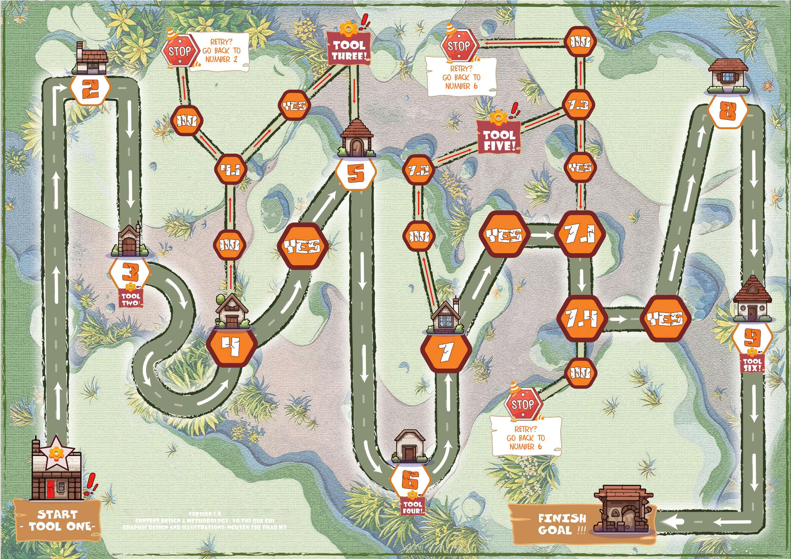 The game presents the different steps involved in planning an evaluation. It takes players on a road trip over different lands of evaluation: purpose, scope/focus, sense-checking, feasibility, and use. These steps are phrased in the form of questions so that players can discuss with their mates and agree on answers. By the end of the game, these answers will form a draft evaluation plan. Along the way, there are tools to help players complete the journey. The game stops when players finish the last question on the map.
