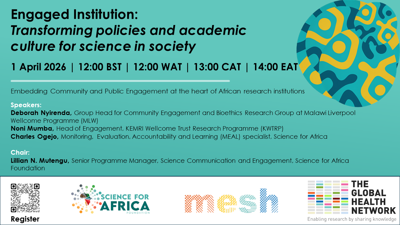 The traditional "ivory tower" model of scientific research is increasingly being replaced by a paradigm that values inclusivity, trust, and societal relevance. While Community and Public Engagement (CPE) has garnered attention as a critical element of the research ecosystem, its implementation often remains peripheral in research functions. In this second webinar of a four-part series, we sustain discussion on how to "Institutionalize" CPE within the African research context. This webinar will explore the necessary "systemic turn" required to shift CPE into a structural, sustainable part of the scientific research system - from organizational strategy, to developing Standard Operating Procedures (SOPs), and building the evidence base through Monitoring, Evaluation, Accountability and Learning (MEAL).